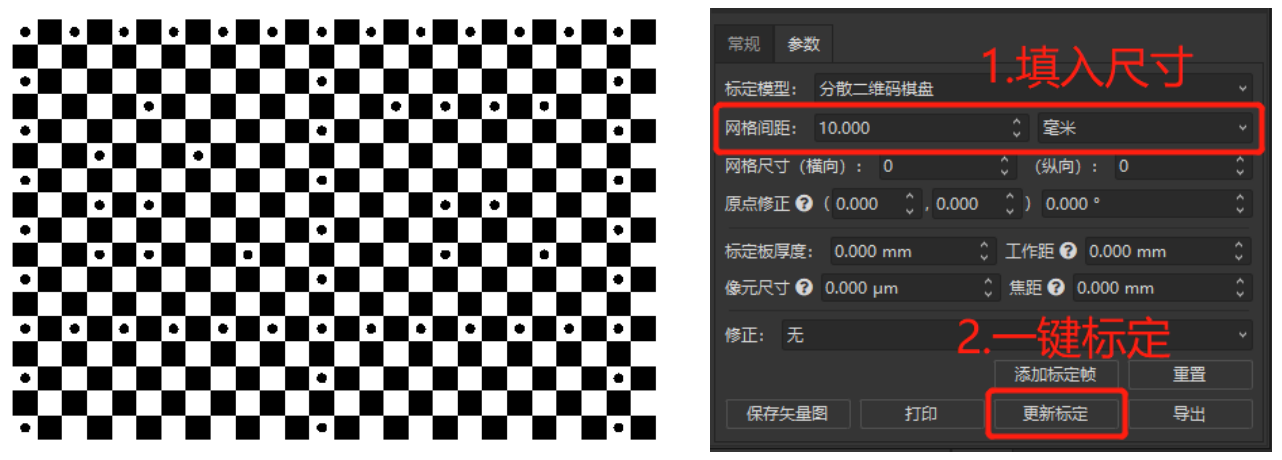 通過(guò)市場(chǎng)需求的調(diào)研,我們發(fā)現(xiàn)圖1中傳統(tǒng)棋盤(pán)格標(biāo)定的流程比較復(fù)雜,用戶(hù)除了需要知道網(wǎng)格的尺寸以外,還要通過(guò)數(shù)的方式確定在相機(jī)視野中的網(wǎng)格數(shù)量來(lái)完成標(biāo)定,如果實(shí)際應(yīng)用場(chǎng)景中網(wǎng)格間距尺寸比較小,用戶(hù)很可能數(shù)錯(cuò)導(dǎo)致最后標(biāo)定失敗。
