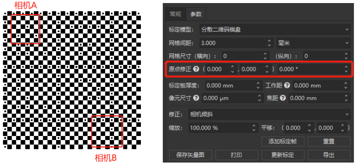 如上圖所示,用戶(hù)通過(guò)輸入網(wǎng)格間距、尺寸、原點(diǎn)修正等信息,可以將多個(gè)相機(jī)標(biāo)定在同一坐標(biāo)系內(nèi),實(shí)現(xiàn)多個(gè)相機(jī)的聯(lián)合標(biāo)定,從而計(jì)算出兩個(gè)相機(jī)內(nèi)任意兩點(diǎn)或者其他特征的距離。