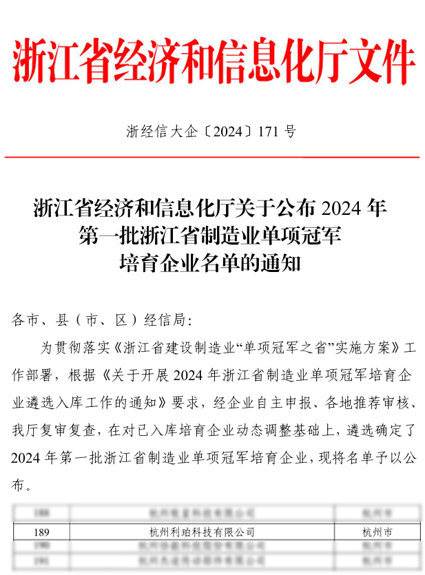 8月23日,浙江省經(jīng)濟和信息化廳公布了《2024年首批浙江省制造業(yè)單項冠軍培育企業(yè)名單》,利珀科技成功入選。