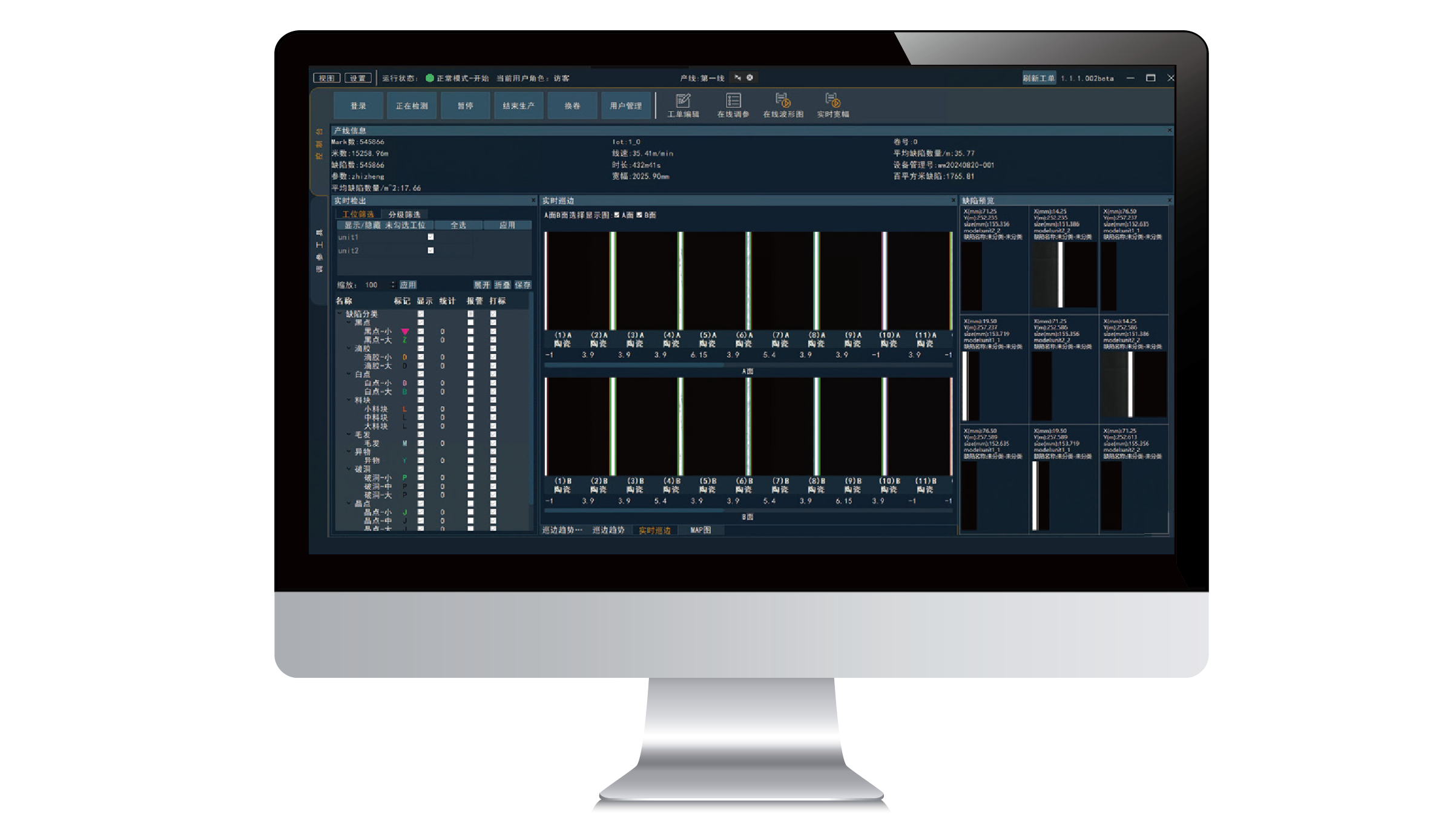 基于利珀多年平面材料檢測(cè)經(jīng)驗(yàn),推出通用卷材軟件飛瀑(FilmPort)。飛瀑應(yīng)用于平面材料連續(xù)化生產(chǎn)缺陷檢測(cè),滿足流延、涂布、復(fù)合、分切等多種設(shè)備場(chǎng)景,為多工位、多相機(jī)協(xié)同作業(yè)的連續(xù)化生產(chǎn)現(xiàn)場(chǎng)帶來便捷迅速的視覺檢測(cè)體驗(yàn)。用戶可以自行配置產(chǎn)線信息、工位信息、相機(jī)數(shù)量、UI 模塊等,從而實(shí)現(xiàn)理想的界面展示效果。