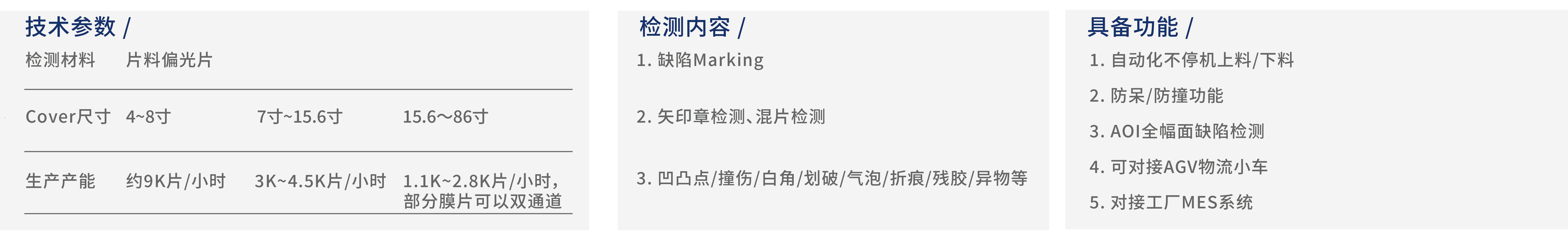 設(shè)備用于偏光片的檢測(cè),采用自動(dòng)上下料以及特制輸送結(jié)構(gòu),搭配自研AOI檢測(cè)軟件,對(duì)矢印章、缺陷打標(biāo)Mark、異物、氣泡、劃傷、凹凸點(diǎn)、折痕、撞傷、殘膠、臟污等缺陷進(jìn)行精準(zhǔn)檢測(cè)以及OK/NG分流,把控出貨產(chǎn)品質(zhì)量。